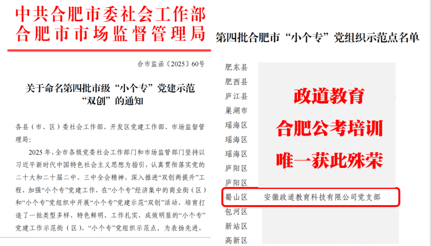 经严格的综合评估、实地核查、网上公示,合肥市委社会工作部、合肥市市场监督管理局决定,命名政道教育为:合肥市“小个专”党组织工作示范点。这是我司首次获得合肥市市级荣誉,也是合肥公考培训行业唯一获此殊荣的培训机构。
