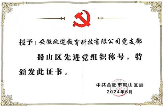 2024年6月,获评合肥市蜀山区“先进党组织”荣誉称号。(合肥公考行业唯一)