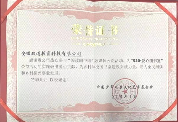 2024年1月,政道教育积极参与“阅读阅中国”融媒体公益活动,为“520.爱心图书室”公益活动的实施做出爱心贡献,助力全民阅读和乡村振兴事业发展 。