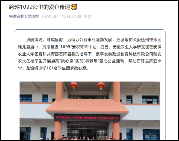 政道教育努力履行社会责任,积极响应琥珀街道安农社区号召,认领微心愿,政道教育党支部给社区残障老人购买轮椅、拐杖、收音机等生活物品,2021年11月17日,合肥市广播电台下属微信公众号“今日蜀山”栏目专题报道,取得了良好的社会效益。